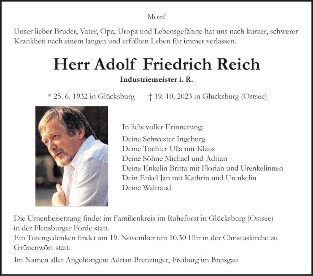 Hier finden Sie alle Traueranzeigen aus der Zeitung, die bisher für Adolf Friedrich Reich erschienen sind. Weitere Traueranzeigen, die in der Zeitung erscheinen, werden hier ebenfalls aufgelistet