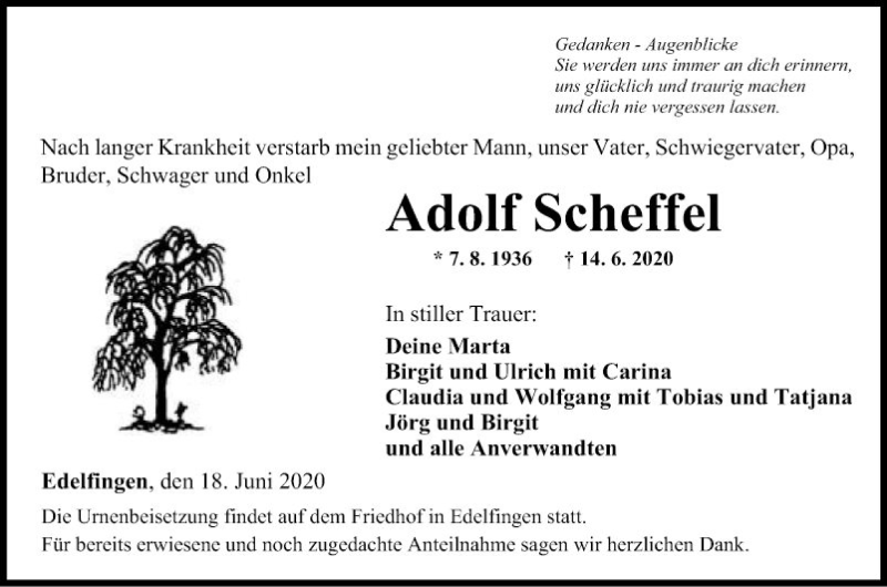 Hier finden Sie alle Traueranzeigen aus der Zeitung, die bisher für Adolf Scheffel erschienen sind. Weitere Traueranzeigen, die in der Zeitung erscheinen, werden hier ebenfalls aufgelistet
