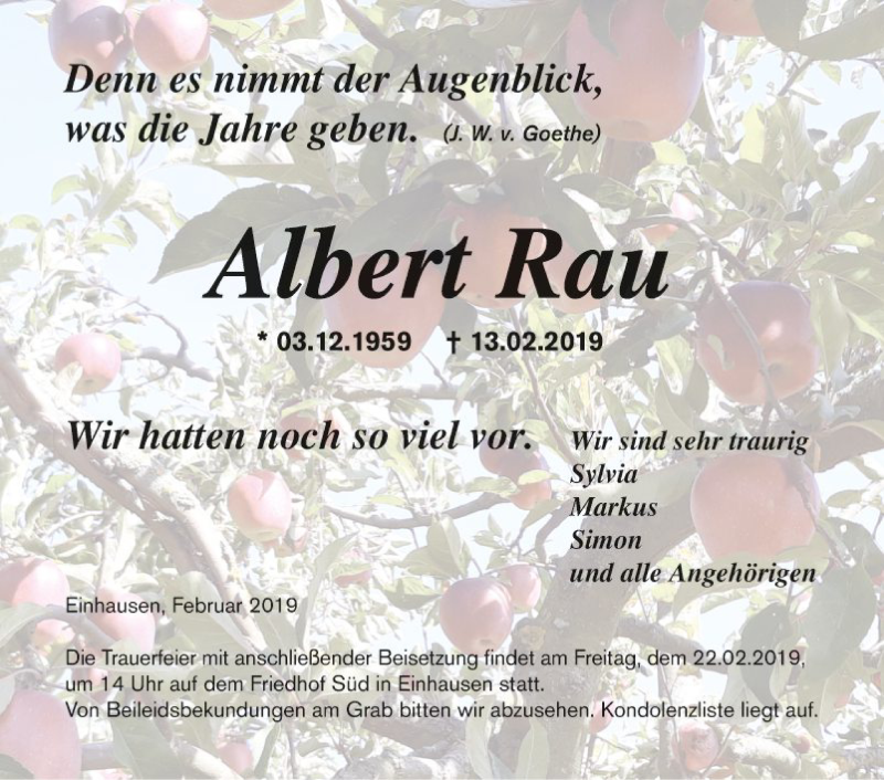 Hier finden Sie alle Traueranzeigen aus der Zeitung, die bisher für Albert Rau erschienen sind. Weitere Traueranzeigen, die in der Zeitung erscheinen, werden hier ebenfalls aufgelistet