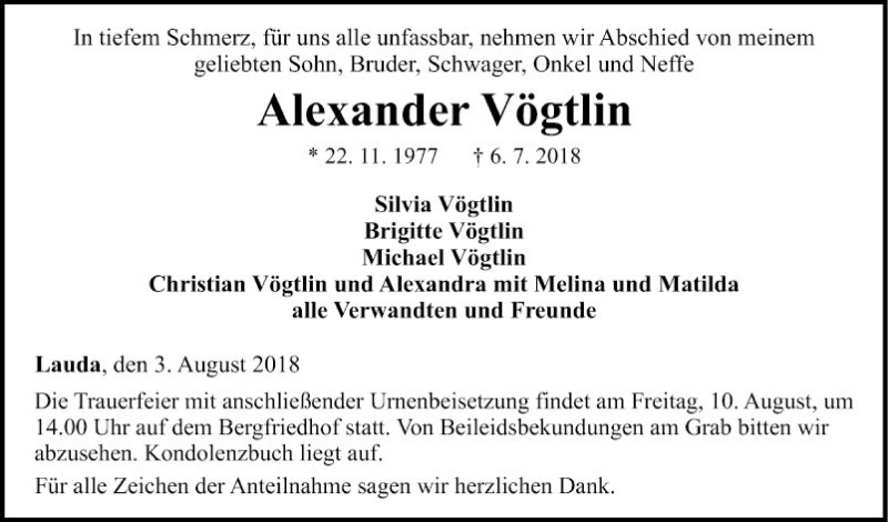 Hier finden Sie alle Traueranzeigen aus der Zeitung, die bisher für Alexander Vögtlin erschienen sind. Weitere Traueranzeigen, die in der Zeitung erscheinen, werden hier ebenfalls aufgelistet