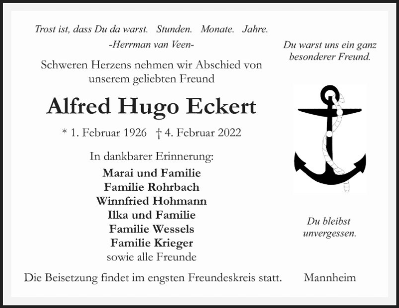 Hier finden Sie alle Traueranzeigen aus der Zeitung, die bisher für Alfred Hugo Eckert erschienen sind. Weitere Traueranzeigen, die in der Zeitung erscheinen, werden hier ebenfalls aufgelistet