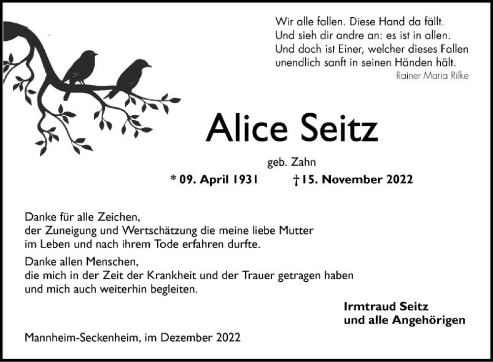 Hier finden Sie alle Traueranzeigen aus der Zeitung, die bisher für Alice Seitz erschienen sind. Weitere Traueranzeigen, die in der Zeitung erscheinen, werden hier ebenfalls aufgelistet