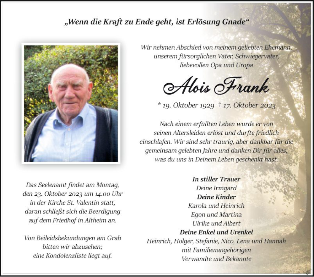 Hier finden Sie alle Traueranzeigen aus der Zeitung, die bisher für Alois Frank erschienen sind. Weitere Traueranzeigen, die in der Zeitung erscheinen, werden hier ebenfalls aufgelistet