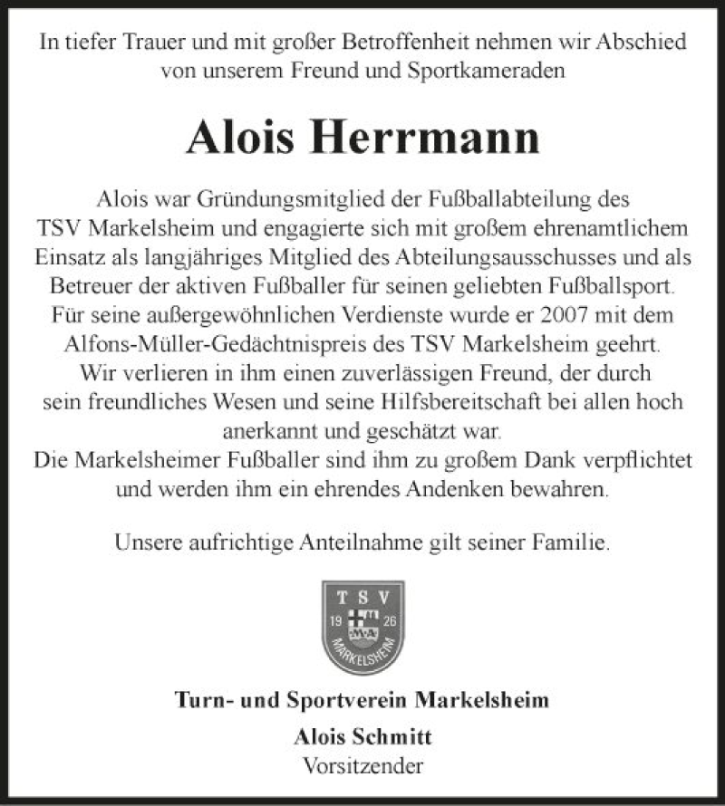 Hier finden Sie alle Traueranzeigen aus der Zeitung, die bisher für Alois Herrmann erschienen sind. Weitere Traueranzeigen, die in der Zeitung erscheinen, werden hier ebenfalls aufgelistet