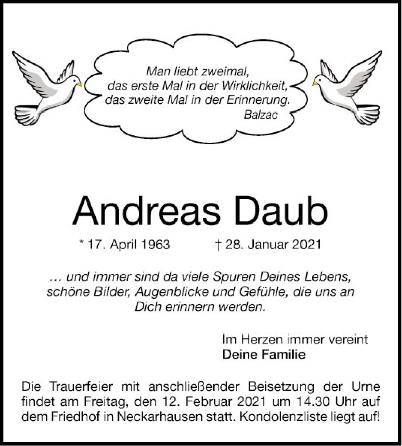 Hier finden Sie alle Traueranzeigen aus der Zeitung, die bisher für Andreas Daub erschienen sind. Weitere Traueranzeigen, die in der Zeitung erscheinen, werden hier ebenfalls aufgelistet