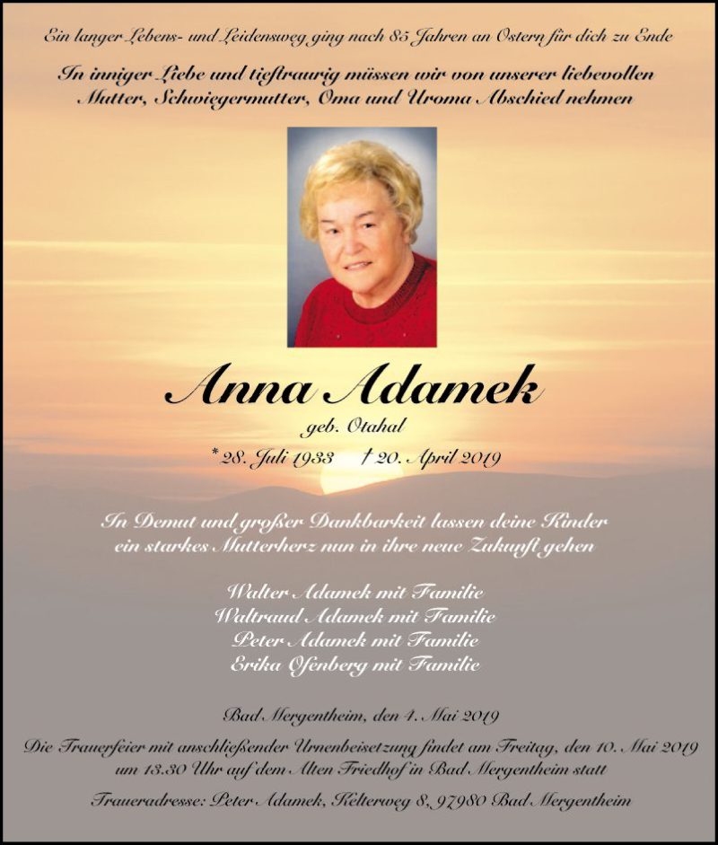 Hier finden Sie alle Traueranzeigen aus der Zeitung, die bisher für Anna Adamek erschienen sind. Weitere Traueranzeigen, die in der Zeitung erscheinen, werden hier ebenfalls aufgelistet