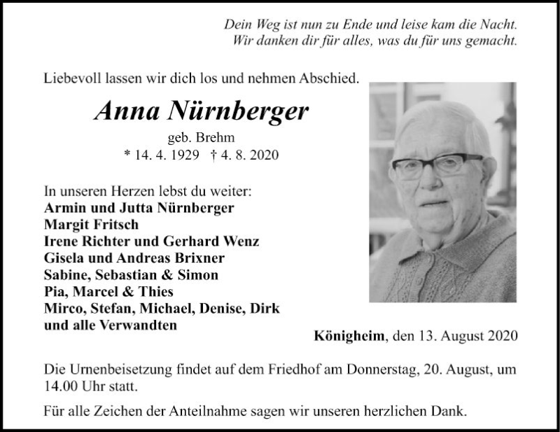 Hier finden Sie alle Traueranzeigen aus der Zeitung, die bisher für Anna Nürnberger erschienen sind. Weitere Traueranzeigen, die in der Zeitung erscheinen, werden hier ebenfalls aufgelistet