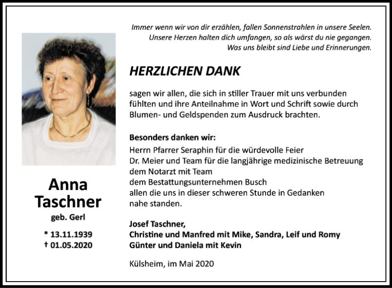 Hier finden Sie alle Traueranzeigen aus der Zeitung, die bisher für Anna Taschner erschienen sind. Weitere Traueranzeigen, die in der Zeitung erscheinen, werden hier ebenfalls aufgelistet
