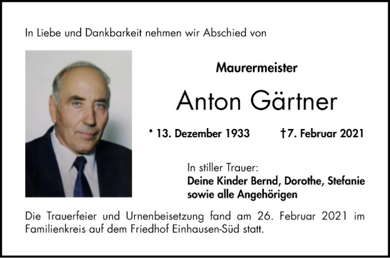 Hier finden Sie alle Traueranzeigen aus der Zeitung, die bisher für Anton Gärtner erschienen sind. Weitere Traueranzeigen, die in der Zeitung erscheinen, werden hier ebenfalls aufgelistet