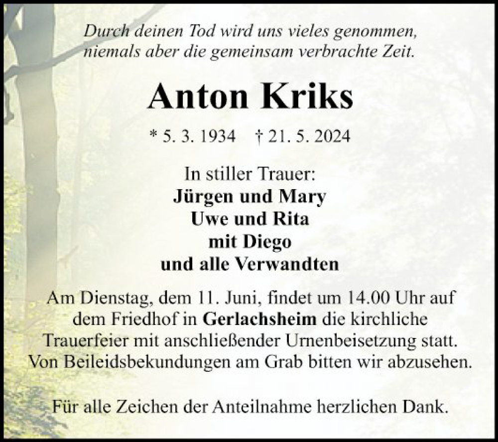 Hier finden Sie alle Traueranzeigen aus der Zeitung, die bisher für Anton Kriks erschienen sind. Weitere Traueranzeigen, die in der Zeitung erscheinen, werden hier ebenfalls aufgelistet