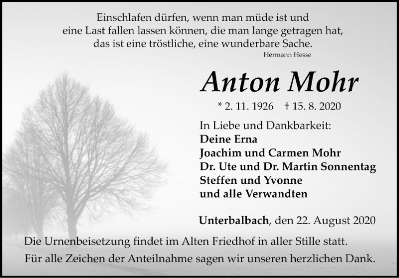Hier finden Sie alle Traueranzeigen aus der Zeitung, die bisher für Anton Mohr erschienen sind. Weitere Traueranzeigen, die in der Zeitung erscheinen, werden hier ebenfalls aufgelistet