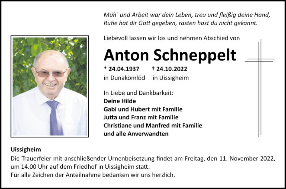 Hier finden Sie alle Traueranzeigen aus der Zeitung, die bisher für Anton Schneppelt erschienen sind. Weitere Traueranzeigen, die in der Zeitung erscheinen, werden hier ebenfalls aufgelistet