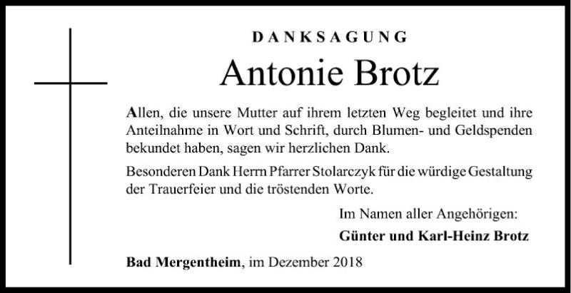 Hier finden Sie alle Traueranzeigen aus der Zeitung, die bisher für Antonie Brotz erschienen sind. Weitere Traueranzeigen, die in der Zeitung erscheinen, werden hier ebenfalls aufgelistet
