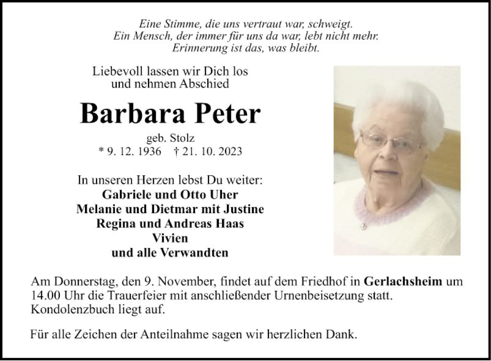 Hier finden Sie alle Traueranzeigen aus der Zeitung, die bisher für Barbara Peter erschienen sind. Weitere Traueranzeigen, die in der Zeitung erscheinen, werden hier ebenfalls aufgelistet