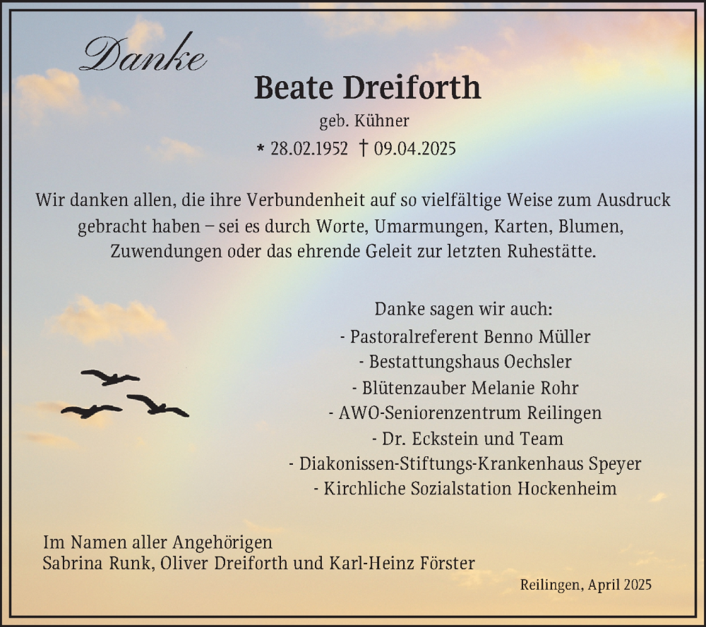 Hier finden Sie alle Traueranzeigen aus der Zeitung, die bisher für Beate Dreiforth erschienen sind. Weitere Traueranzeigen, die in der Zeitung erscheinen, werden hier ebenfalls aufgelistet