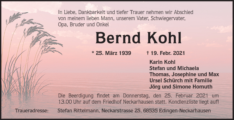 Hier finden Sie alle Traueranzeigen aus der Zeitung, die bisher für Bernd Kohl erschienen sind. Weitere Traueranzeigen, die in der Zeitung erscheinen, werden hier ebenfalls aufgelistet