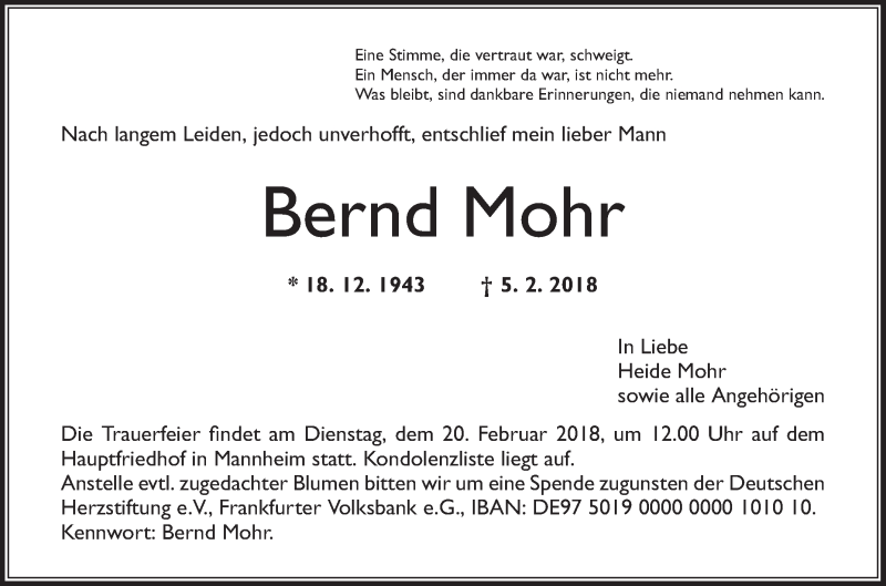 Hier finden Sie alle Traueranzeigen aus der Zeitung, die bisher für Bernd Mohr erschienen sind. Weitere Traueranzeigen, die in der Zeitung erscheinen, werden hier ebenfalls aufgelistet