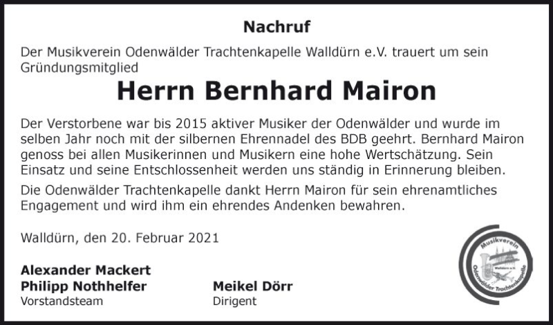Hier finden Sie alle Traueranzeigen aus der Zeitung, die bisher für Bernhard Mairon erschienen sind. Weitere Traueranzeigen, die in der Zeitung erscheinen, werden hier ebenfalls aufgelistet