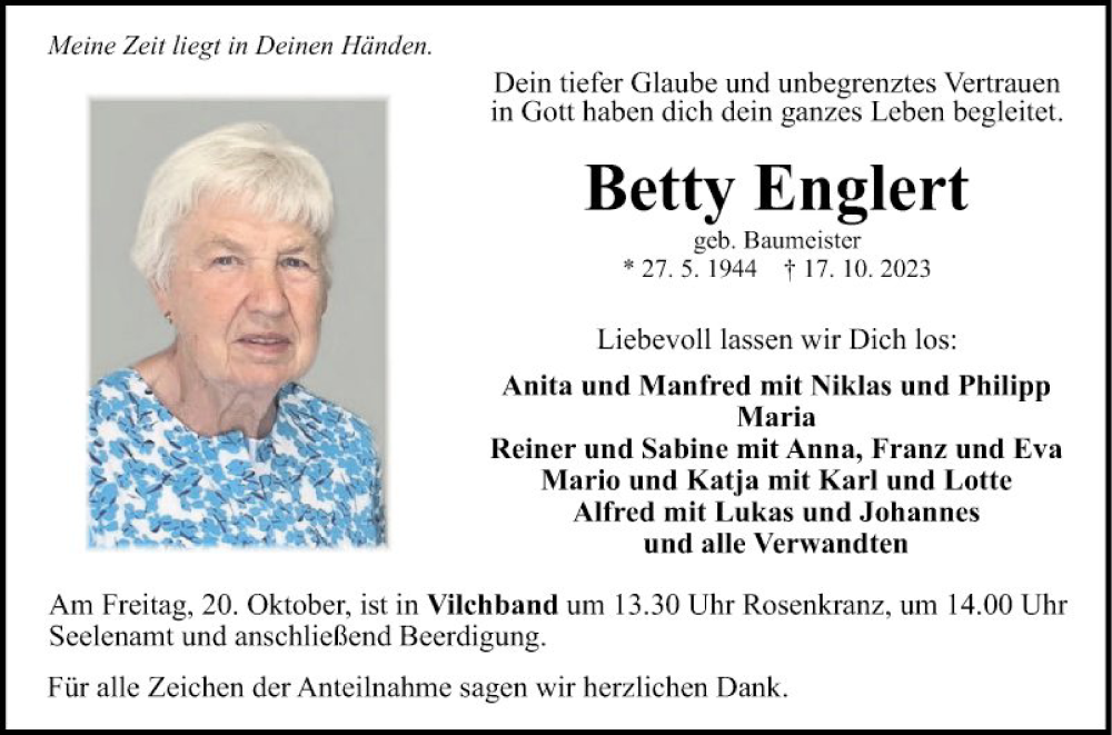 Hier finden Sie alle Traueranzeigen aus der Zeitung, die bisher für Betty Englert erschienen sind. Weitere Traueranzeigen, die in der Zeitung erscheinen, werden hier ebenfalls aufgelistet