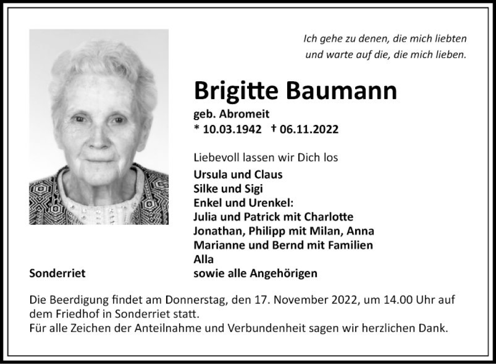 Hier finden Sie alle Traueranzeigen aus der Zeitung, die bisher für Brigitte Baumann erschienen sind. Weitere Traueranzeigen, die in der Zeitung erscheinen, werden hier ebenfalls aufgelistet