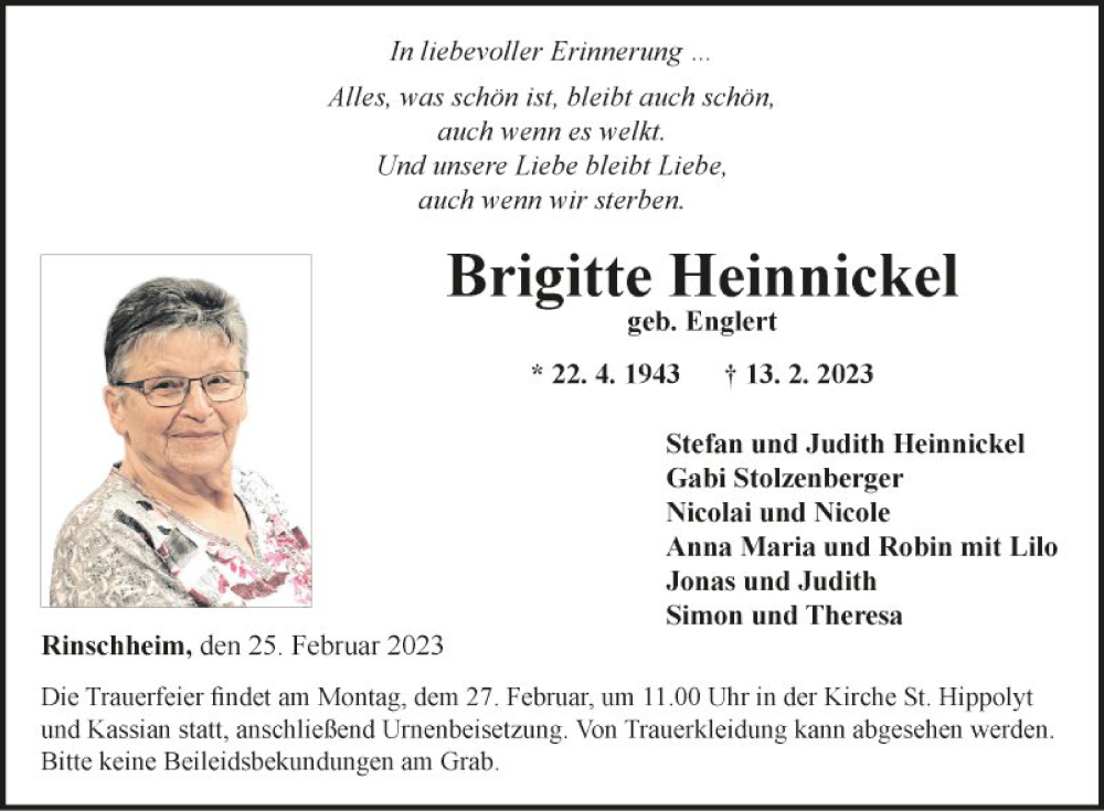 Hier finden Sie alle Traueranzeigen aus der Zeitung, die bisher für Brigitte Heinnickel erschienen sind. Weitere Traueranzeigen, die in der Zeitung erscheinen, werden hier ebenfalls aufgelistet