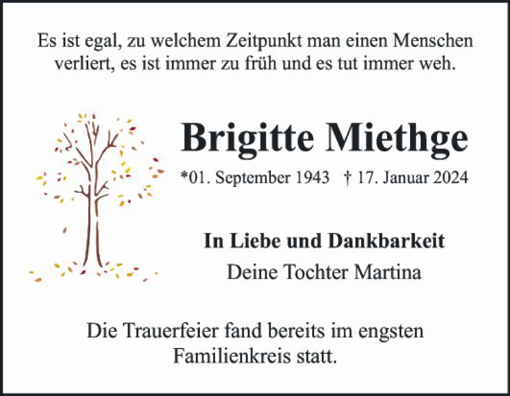 Hier finden Sie alle Traueranzeigen aus der Zeitung, die bisher für Brigitte Miethge erschienen sind. Weitere Traueranzeigen, die in der Zeitung erscheinen, werden hier ebenfalls aufgelistet