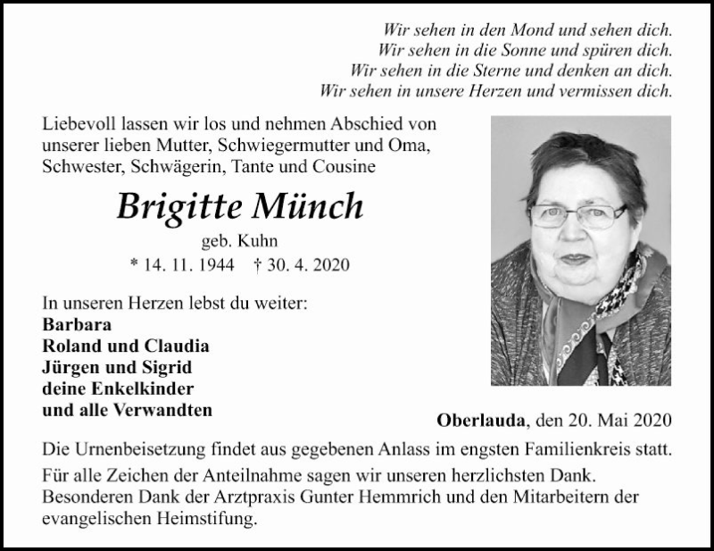 Hier finden Sie alle Traueranzeigen aus der Zeitung, die bisher für Brigitte Münch erschienen sind. Weitere Traueranzeigen, die in der Zeitung erscheinen, werden hier ebenfalls aufgelistet