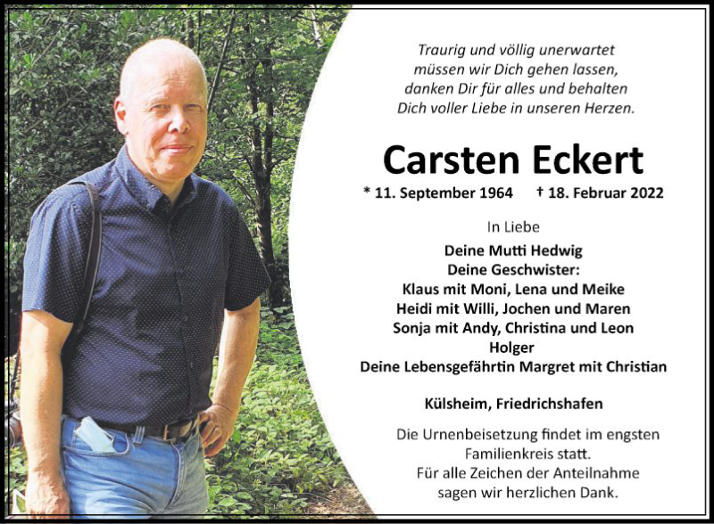 Hier finden Sie alle Traueranzeigen aus der Zeitung, die bisher für Carsten Eckert erschienen sind. Weitere Traueranzeigen, die in der Zeitung erscheinen, werden hier ebenfalls aufgelistet