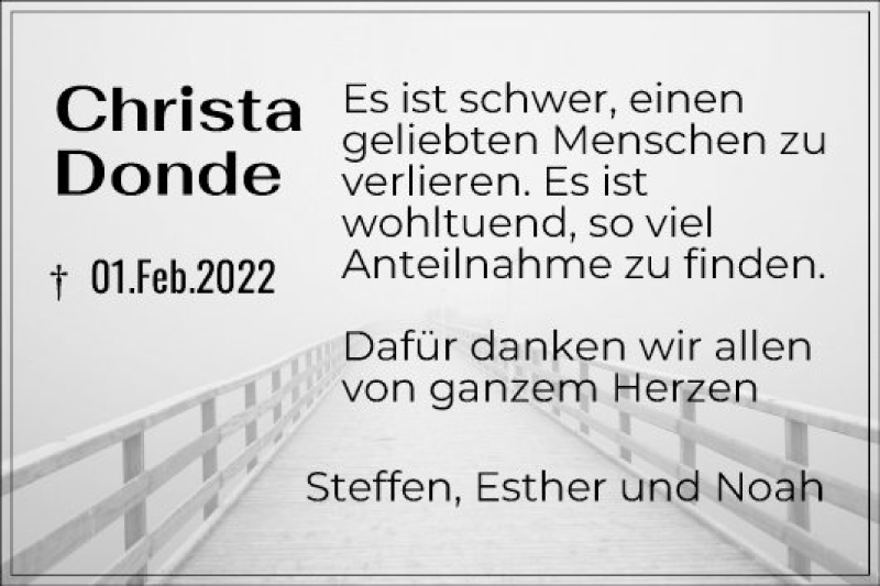 Hier finden Sie alle Traueranzeigen aus der Zeitung, die bisher für Christa Donde erschienen sind. Weitere Traueranzeigen, die in der Zeitung erscheinen, werden hier ebenfalls aufgelistet