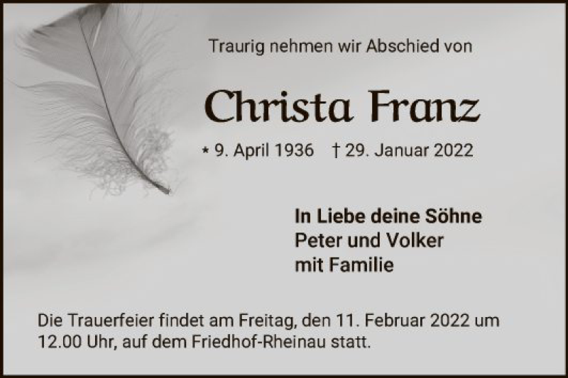 Hier finden Sie alle Traueranzeigen aus der Zeitung, die bisher für Christa Franz erschienen sind. Weitere Traueranzeigen, die in der Zeitung erscheinen, werden hier ebenfalls aufgelistet