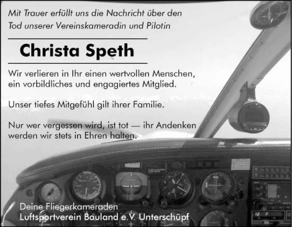 Hier finden Sie alle Traueranzeigen aus der Zeitung, die bisher für Christa Speth erschienen sind. Weitere Traueranzeigen, die in der Zeitung erscheinen, werden hier ebenfalls aufgelistet