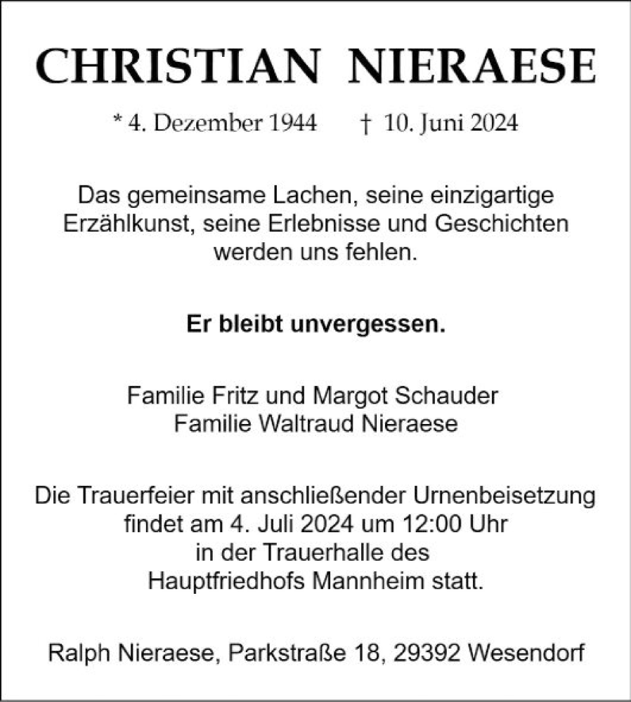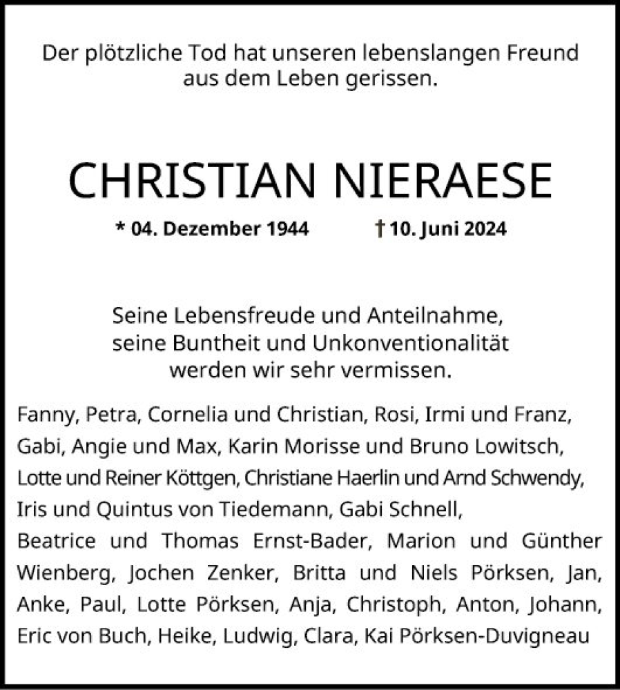Hier finden Sie alle Traueranzeigen aus der Zeitung, die bisher für Christian Nieraese erschienen sind. Weitere Traueranzeigen, die in der Zeitung erscheinen, werden hier ebenfalls aufgelistet