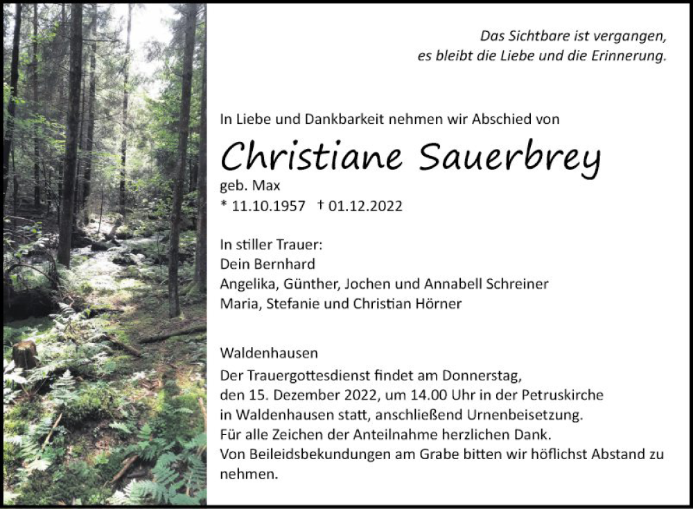 Hier finden Sie alle Traueranzeigen aus der Zeitung, die bisher für Christiane Sauerbrey erschienen sind. Weitere Traueranzeigen, die in der Zeitung erscheinen, werden hier ebenfalls aufgelistet