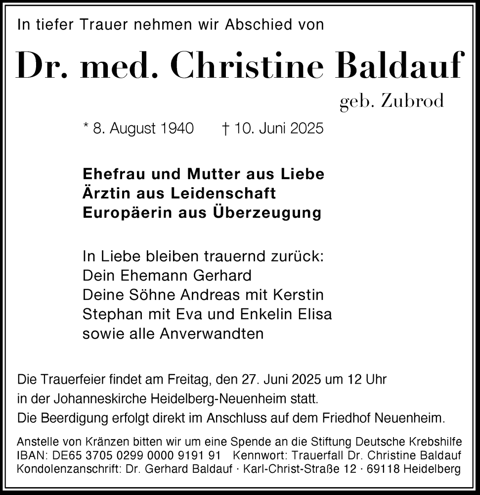 Hier finden Sie alle Traueranzeigen aus der Zeitung, die bisher für Christine Baldauf erschienen sind. Weitere Traueranzeigen, die in der Zeitung erscheinen, werden hier ebenfalls aufgelistet