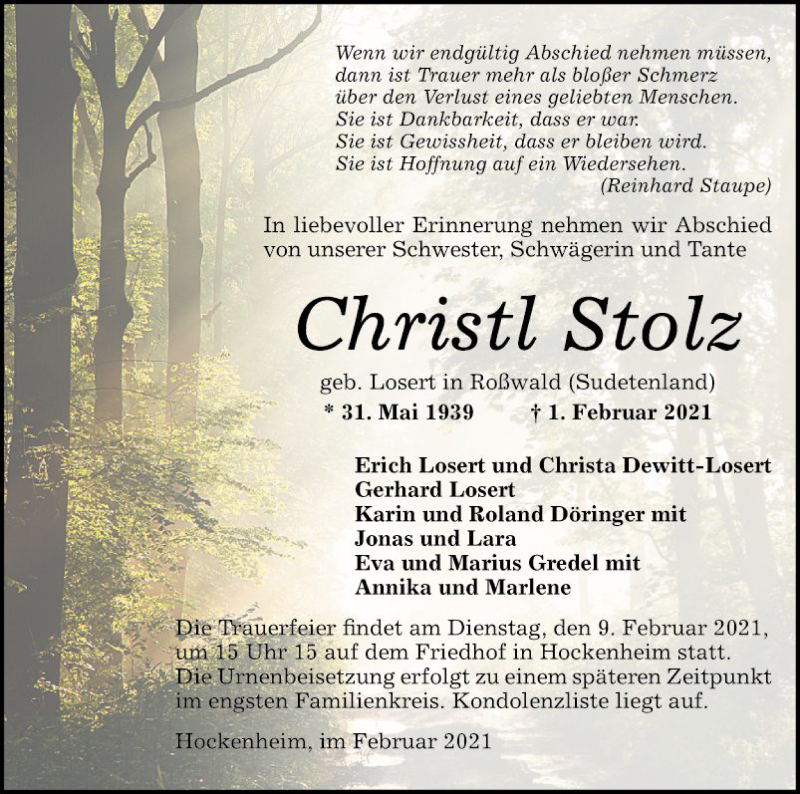 Hier finden Sie alle Traueranzeigen aus der Zeitung, die bisher für Christl Stolz erschienen sind. Weitere Traueranzeigen, die in der Zeitung erscheinen, werden hier ebenfalls aufgelistet