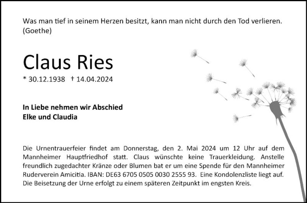Hier finden Sie alle Traueranzeigen aus der Zeitung, die bisher für Claus Ries erschienen sind. Weitere Traueranzeigen, die in der Zeitung erscheinen, werden hier ebenfalls aufgelistet