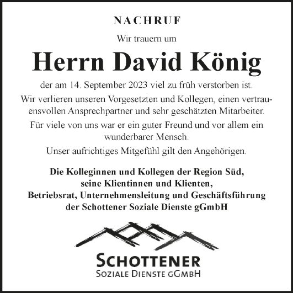 Hier finden Sie alle Traueranzeigen aus der Zeitung, die bisher für David König erschienen sind. Weitere Traueranzeigen, die in der Zeitung erscheinen, werden hier ebenfalls aufgelistet