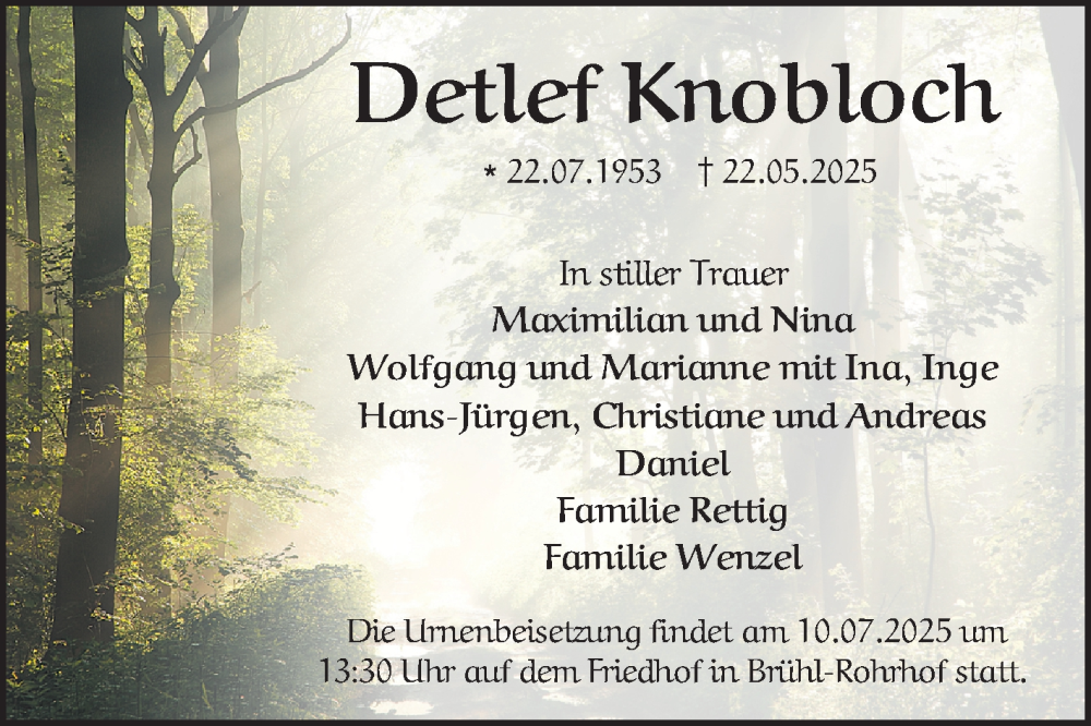 Hier finden Sie alle Traueranzeigen aus der Zeitung, die bisher für Detlef Knobloch erschienen sind. Weitere Traueranzeigen, die in der Zeitung erscheinen, werden hier ebenfalls aufgelistet