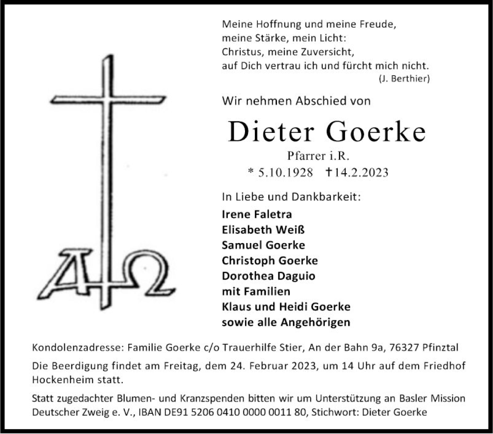 Hier finden Sie alle Traueranzeigen aus der Zeitung, die bisher für Dieter Goerke erschienen sind. Weitere Traueranzeigen, die in der Zeitung erscheinen, werden hier ebenfalls aufgelistet