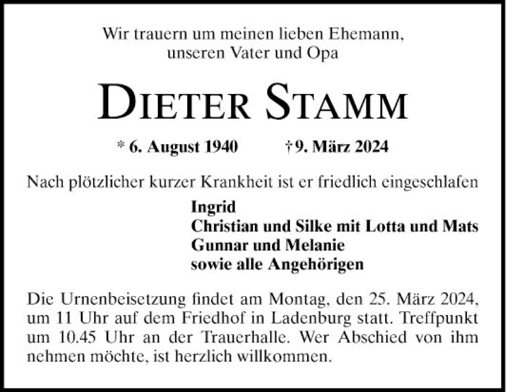Hier finden Sie alle Traueranzeigen aus der Zeitung, die bisher für Dieter Stamm erschienen sind. Weitere Traueranzeigen, die in der Zeitung erscheinen, werden hier ebenfalls aufgelistet