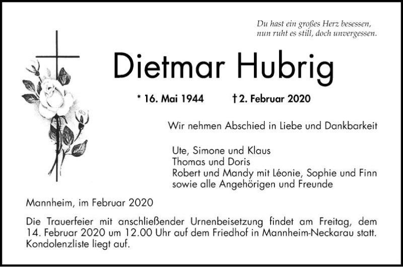 Hier finden Sie alle Traueranzeigen aus der Zeitung, die bisher für Dietmar Hubrig erschienen sind. Weitere Traueranzeigen, die in der Zeitung erscheinen, werden hier ebenfalls aufgelistet