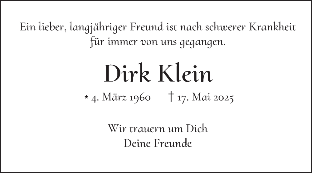 Hier finden Sie alle Traueranzeigen aus der Zeitung, die bisher für Dirk Klein erschienen sind. Weitere Traueranzeigen, die in der Zeitung erscheinen, werden hier ebenfalls aufgelistet