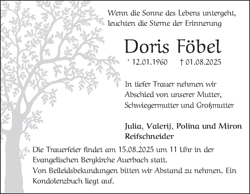 Hier finden Sie alle Traueranzeigen aus der Zeitung, die bisher für Doris Föbel erschienen sind. Weitere Traueranzeigen, die in der Zeitung erscheinen, werden hier ebenfalls aufgelistet