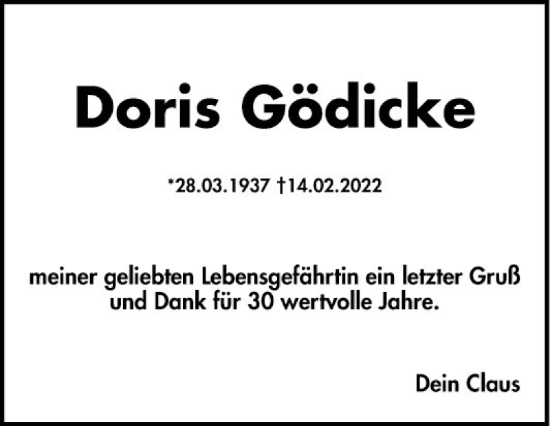 Hier finden Sie alle Traueranzeigen aus der Zeitung, die bisher für Doris Gödicke erschienen sind. Weitere Traueranzeigen, die in der Zeitung erscheinen, werden hier ebenfalls aufgelistet