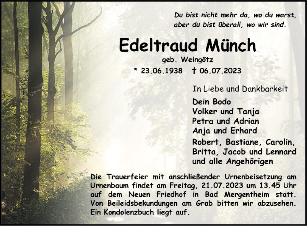 Hier finden Sie alle Traueranzeigen aus der Zeitung, die bisher für Edeltraud Münch erschienen sind. Weitere Traueranzeigen, die in der Zeitung erscheinen, werden hier ebenfalls aufgelistet