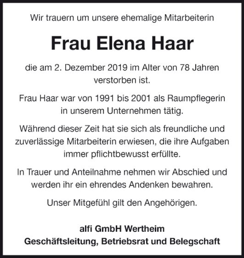 Hier finden Sie alle Traueranzeigen aus der Zeitung, die bisher für Elena Haar erschienen sind. Weitere Traueranzeigen, die in der Zeitung erscheinen, werden hier ebenfalls aufgelistet
