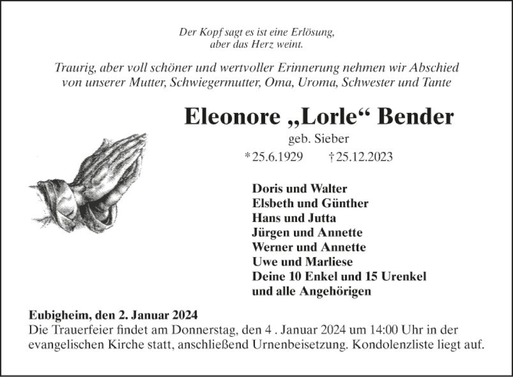 Hier finden Sie alle Traueranzeigen aus der Zeitung, die bisher für Eleonore Bender erschienen sind. Weitere Traueranzeigen, die in der Zeitung erscheinen, werden hier ebenfalls aufgelistet