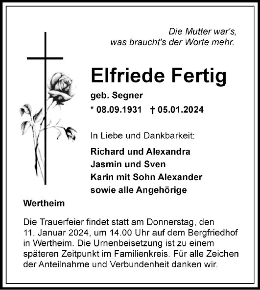 Hier finden Sie alle Traueranzeigen aus der Zeitung, die bisher für Elfriede Fertig erschienen sind. Weitere Traueranzeigen, die in der Zeitung erscheinen, werden hier ebenfalls aufgelistet