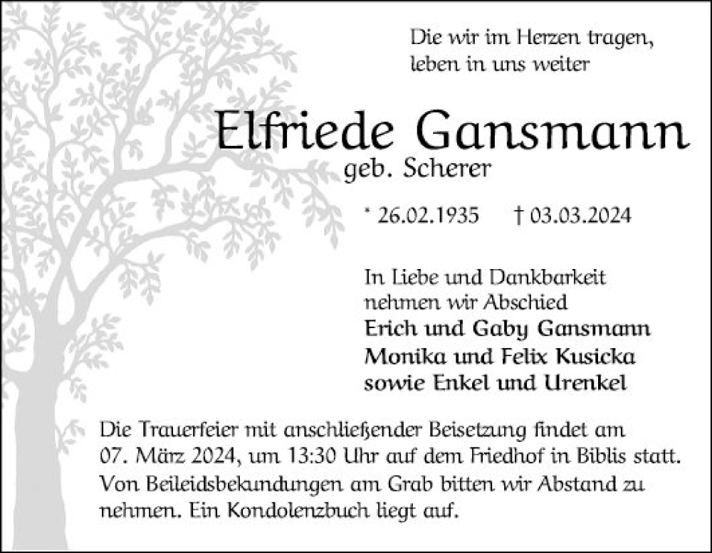 Hier finden Sie alle Traueranzeigen aus der Zeitung, die bisher für Elfriede Gansmann erschienen sind. Weitere Traueranzeigen, die in der Zeitung erscheinen, werden hier ebenfalls aufgelistet