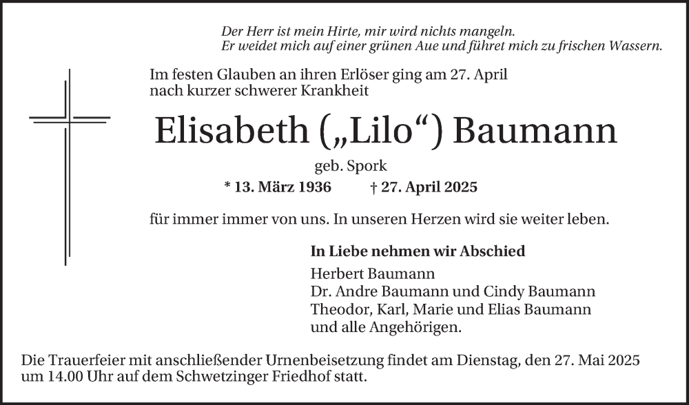 Hier finden Sie alle Traueranzeigen aus der Zeitung, die bisher für Elisabeth Baumann erschienen sind. Weitere Traueranzeigen, die in der Zeitung erscheinen, werden hier ebenfalls aufgelistet